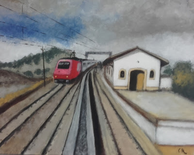Pois parece que haveria temas que não se representariam em tela, mas no caso pensei que no grupo de telas acerca da estação da Funcheira poderia representar o comboio a entrar na estação onde muitas vezes o apanho para Lisboa. Neste momento é a principal ligação desta bela estação de caminhos de ferro. Uma imagem que me agrada pois sou um apreciador de comboios.