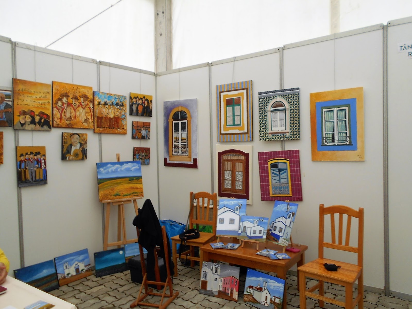 Hoje muita gente passou pela feira de artesanato e aqui podemos ver o meu stand no meio da exposição. Muita gente passou, apreciou e quase já concluí uma pintura enquanto por lá estou. Mostro aqui o stand enquadrado na exposição. Não é perfeito para expôr mas gosto do ambiente. A feira é muito genuina, talvez caso único nas feiras estereotipadas daqui da zona, todas iguais e sem interesse. Esta feira tem cante, violas e cante ao baldão, não tem TVI, Nuno Eiró e outras pimbalhadas