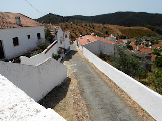 Hoje de manhã deambulei aqui pelo BA e acabei por visitar a vila de Relíquias, numa transição da paisagem alentejana, da planície para zona com mais relevo, que se estende depois para o mar. Fundada no século XVI, deve talvez o seu nome a mais uma Nossa Senhora das Relíquias, das centenas de Nossas Senhoras que o país venera. A visita visava mostrar umas telas num restaurante que me prometera expor para venda, o que de facto aconteceu, com a ajuda da Nossa Senhora claro ! Aproveitei para ver o "vilarejo", ruas sinuosas e estreitas, sempre a subir (até que se desce), muita luz, casa pequenas e térreas, listas azuis, a cor oficial... Deparei-me então com estas casa de dois pisos, raro por ali, a irradiar luz por todos os tijolos. Linda, luminosa, bem conservada. Vale a pena visitar estes locais, onde repousam memórias, onde encontramos raízes, que nos definem um pouco melhor como povo e como pessoas. E a pouco mais de 30 km da minha casa.